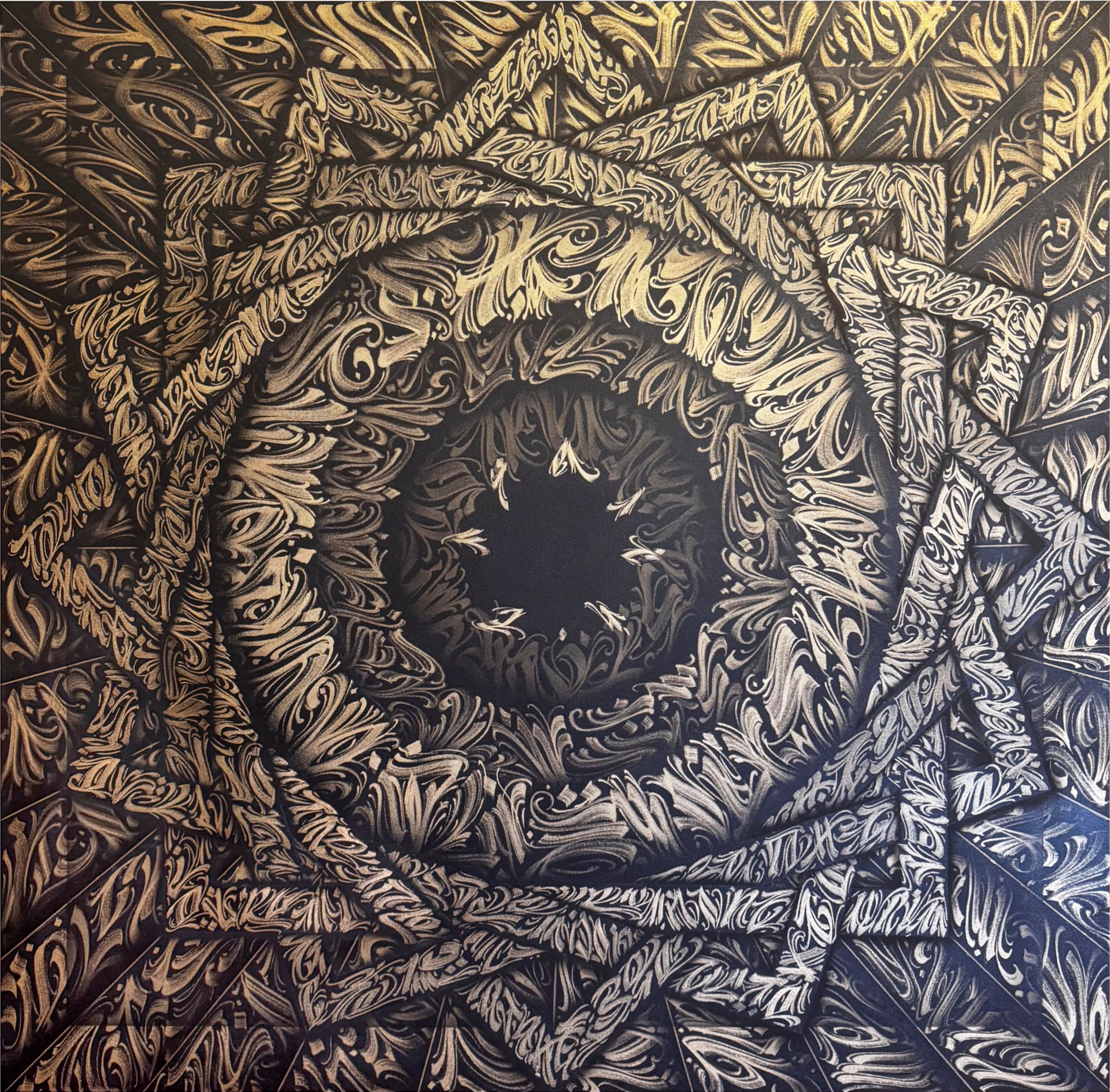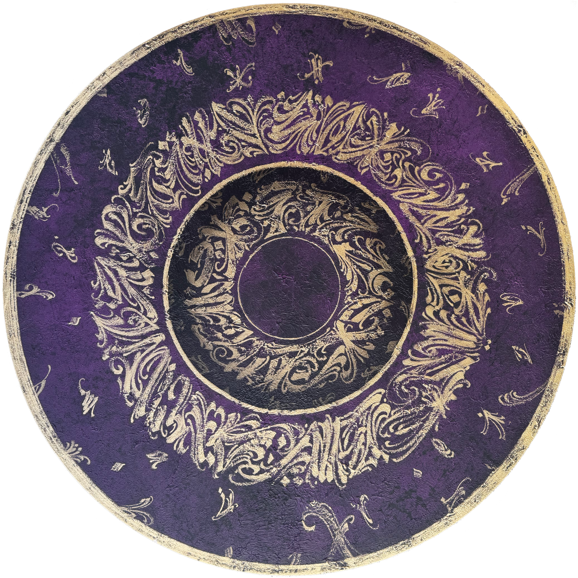 Текст, написанный в переплетении кругов и геометричных композициях картины: «Aurum nostrum non est aurum vulgi. Наше золото — не золото толпы».