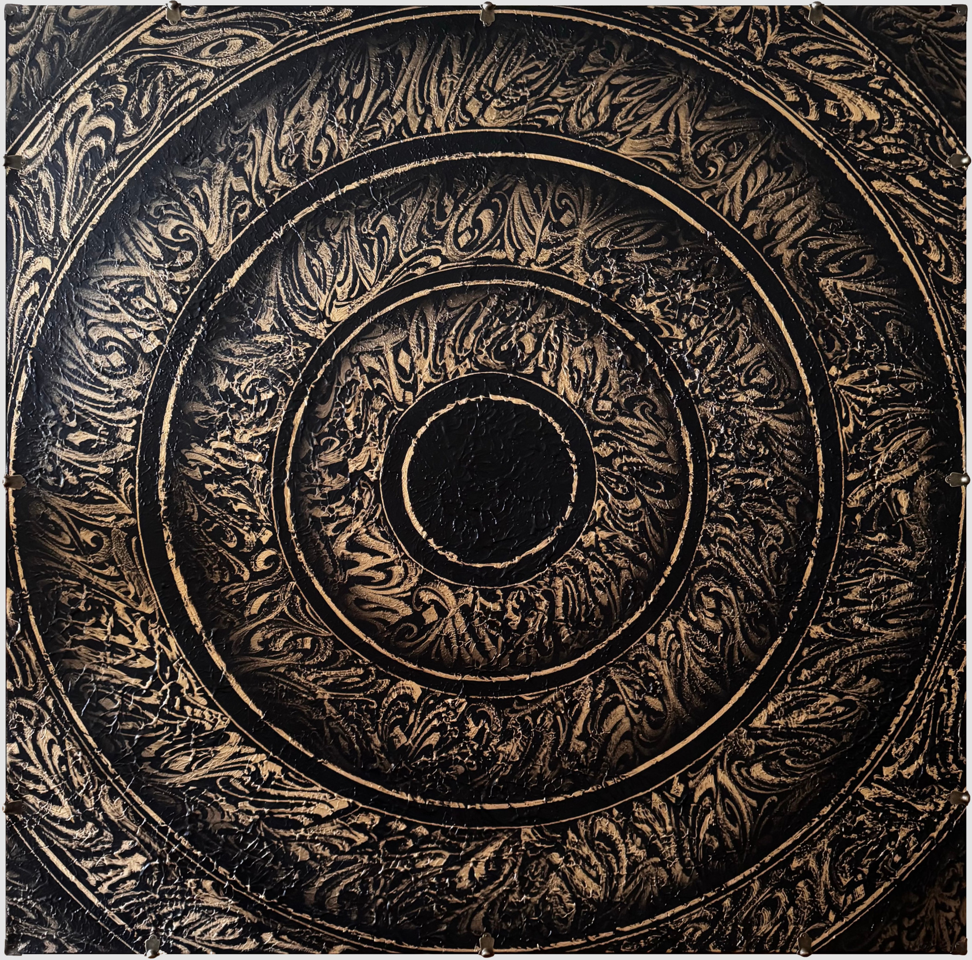 Большая, тяжелая текстурная картина, к которой добавлено финальное «завершение», как показалось автору максимально подходящее под ее визуал, — мебельную фурнитуру по периметру холста, используемую на сундуках и деревянных шкатулках. Выполняет как декоративную, так и дополнительно защитную функцию, придавая завершенность произведению.