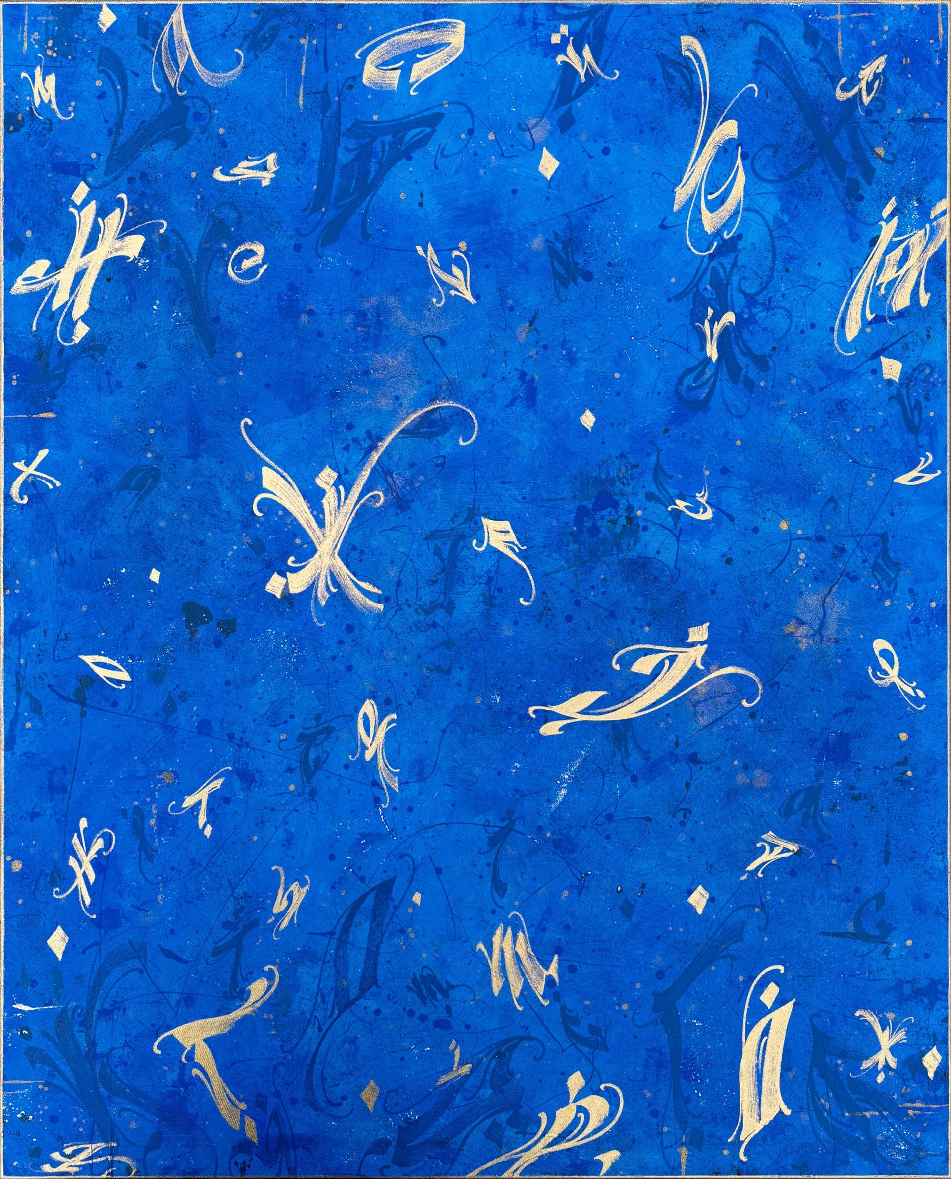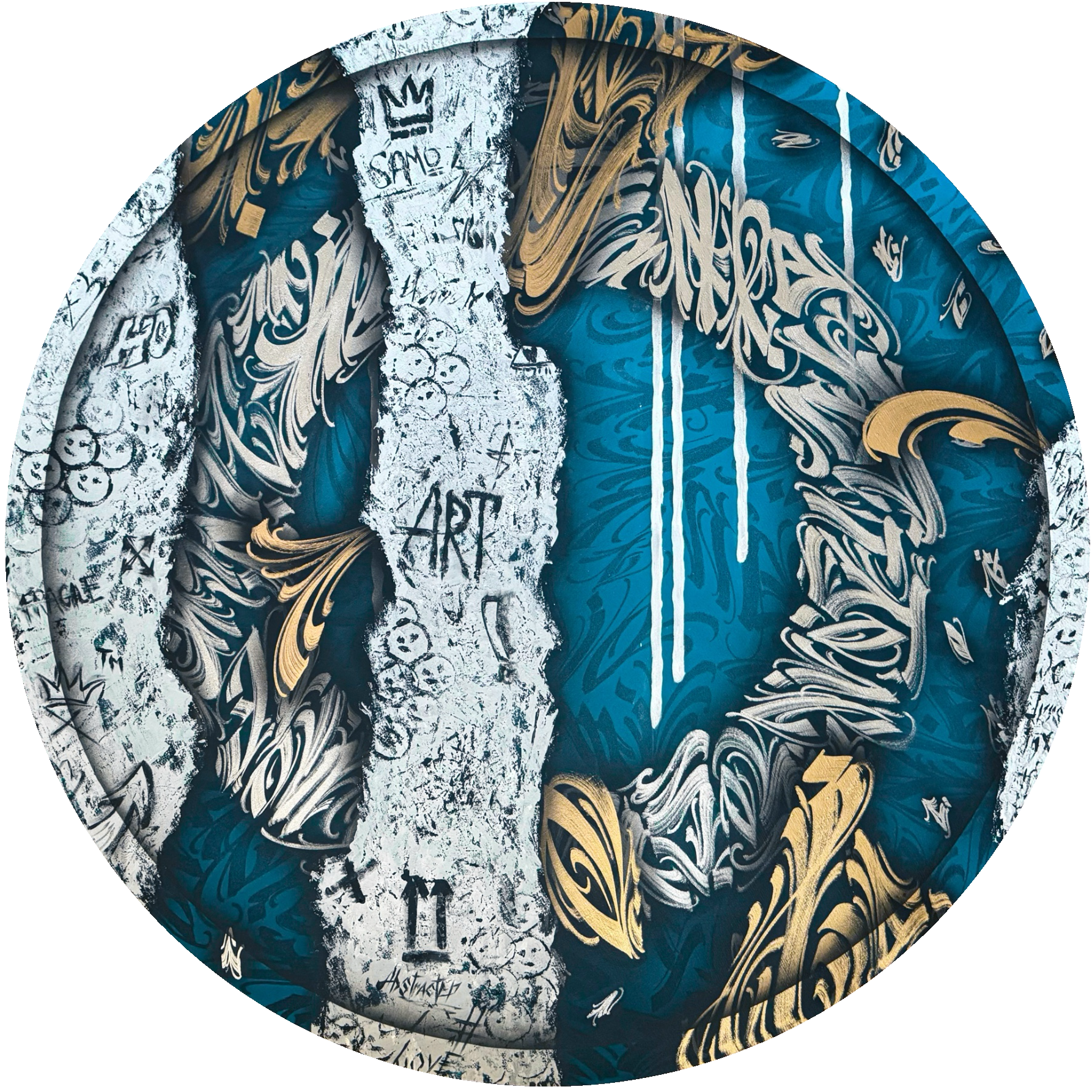 Льняной холст на галлерейном подрамнике, акрил, аэрозоль, спиртовые чернила, бронза.